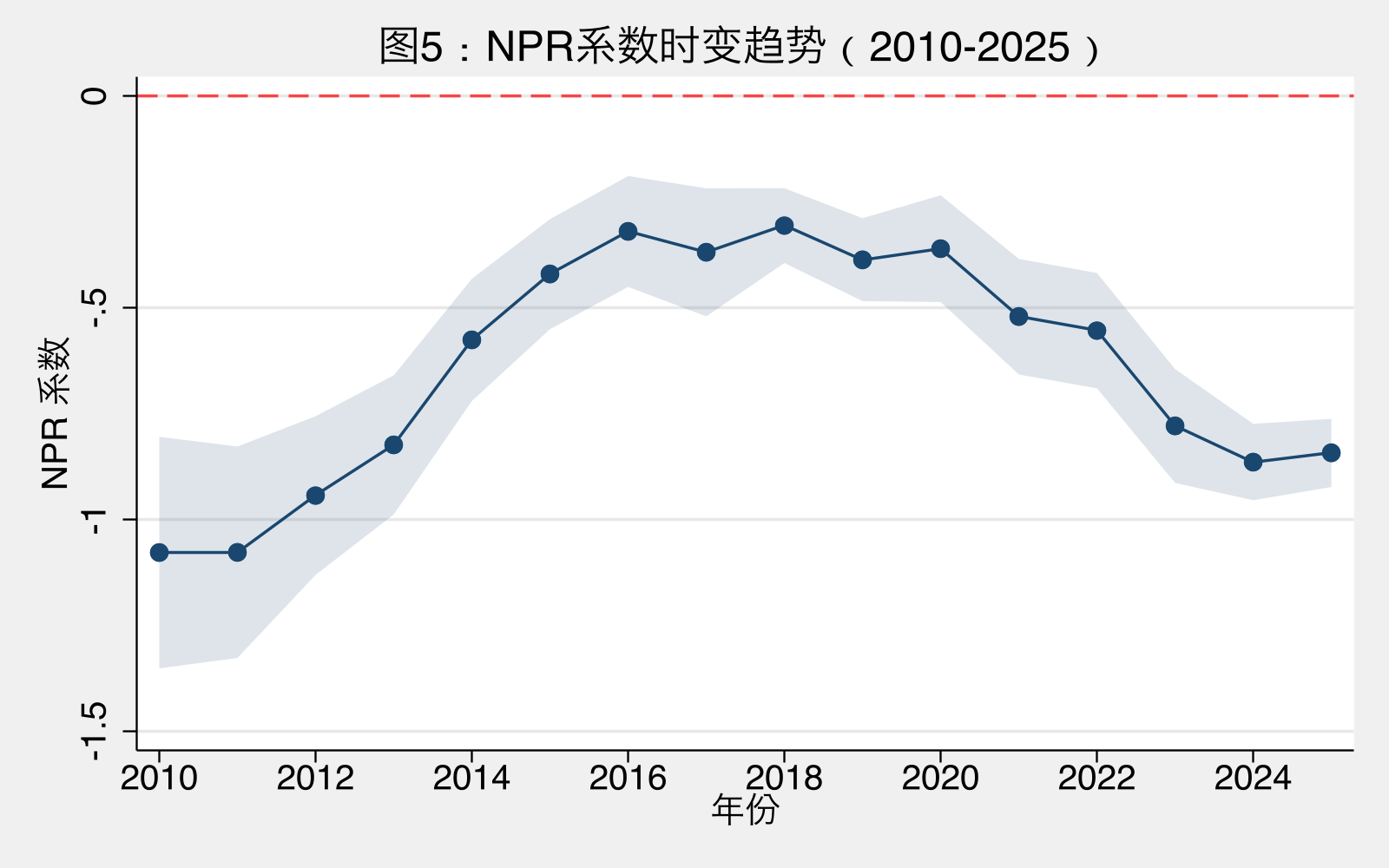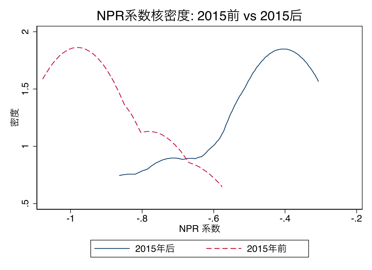 分布平移的统计含义:2015 年前后 NPR 系数的总体分布发生了结构性平移而非简单位置波动,与图5 的轨迹完全一致。这是供给侧改革、注册制改革、监管周期等因素叠加的综合反映。