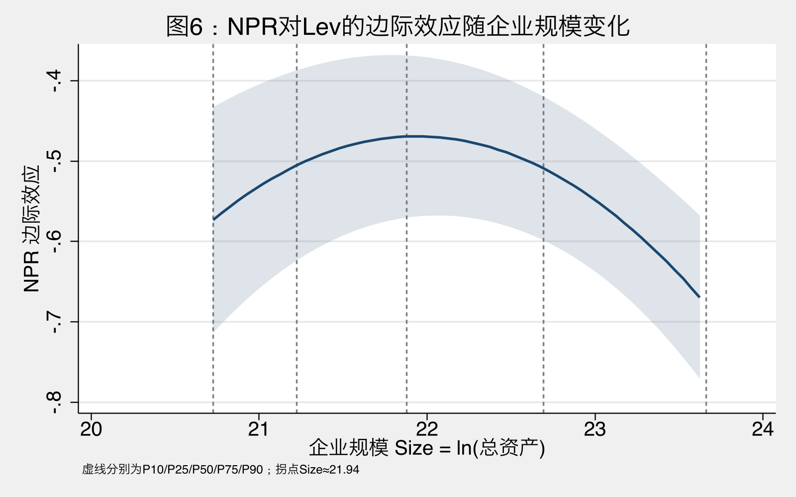两者高度接近,说明”非线性转折”在不同方法下具有一致性。这不是估计偶然,而是数据特征——总资产约 25-30 亿元(exp(21.6-21.9) ≈ 24-32 亿)确实是 NPR-Lev 关系的转折点。