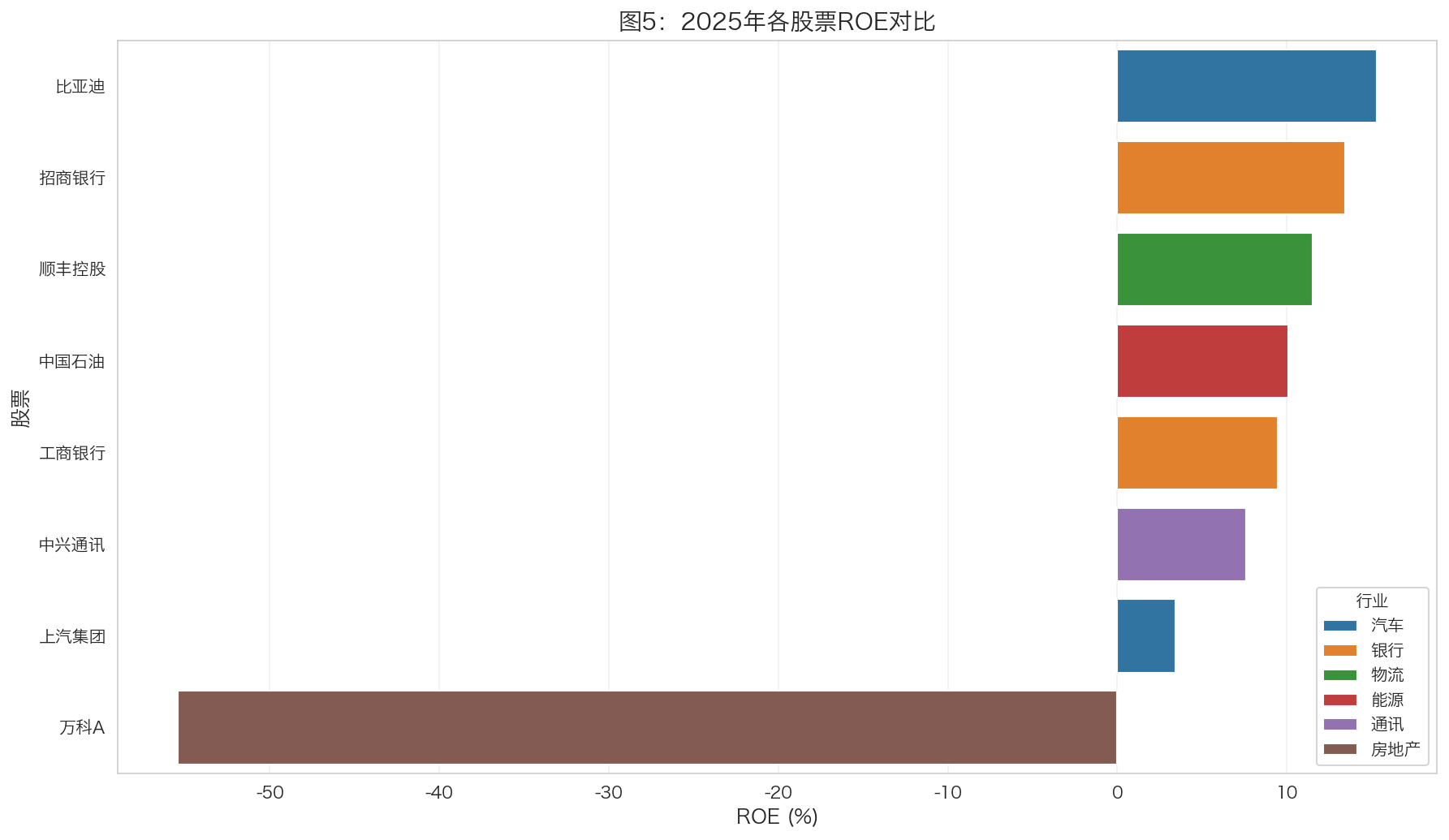 - 能源行业(中国石油):ROE相对较低,受油价影响大