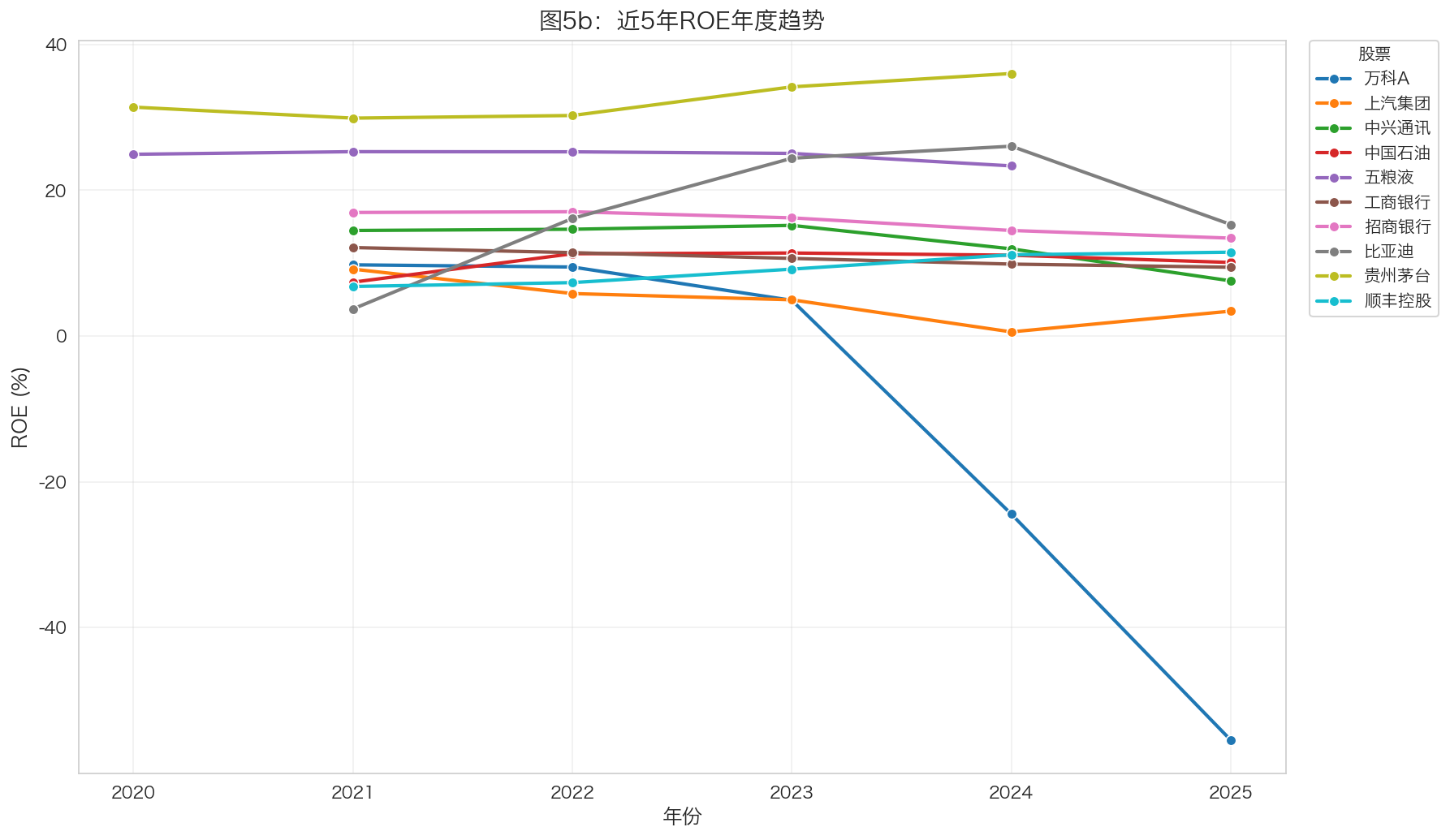 - 房地产行业(万科):ROE逐年下降,反映行业困境
